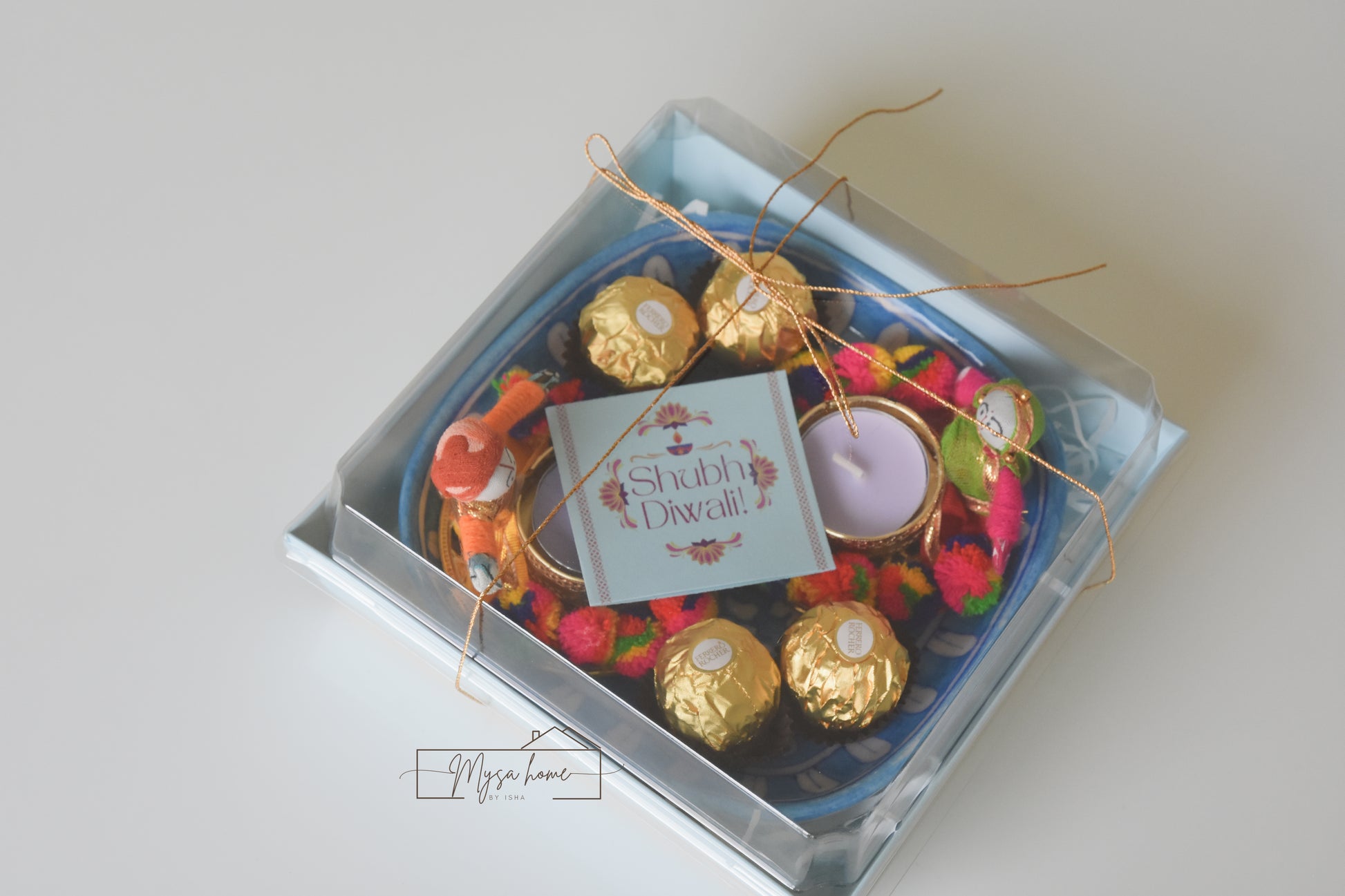 A hamper that brings tradition and elegance together. Handmade artisanal Blue Pottery Platter, along with 2 Puppet tea Light set, and sweets to light up your rituals and celebrations in the most unique way.