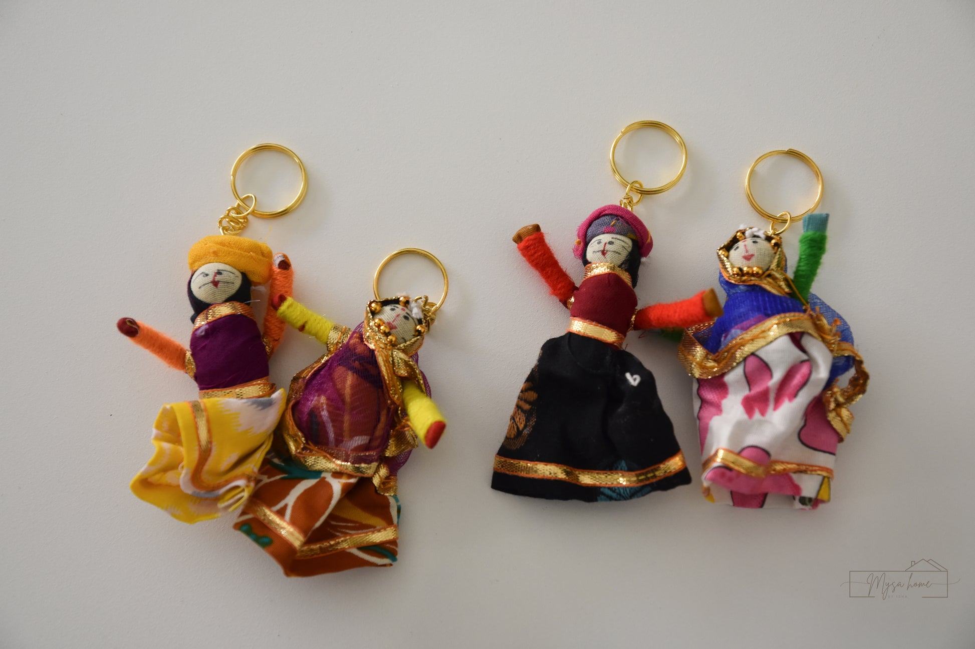 Add a pop of culture and charm to your keys or bags with this handcrafted cotton keychain set. Featuring a vibrant Rajasthani kathputli couple (male & female), each piece showcases intricate detailing and bold colors for a truly eye-catching accessory. Measuring 3.5" x 2.5", they’re compact yet striking. Perfect for everyday use or as unique gifts for birthdays, festivals, weddings, housewarmings, or return favors. Comes as a set of different multi-colored pieces.
