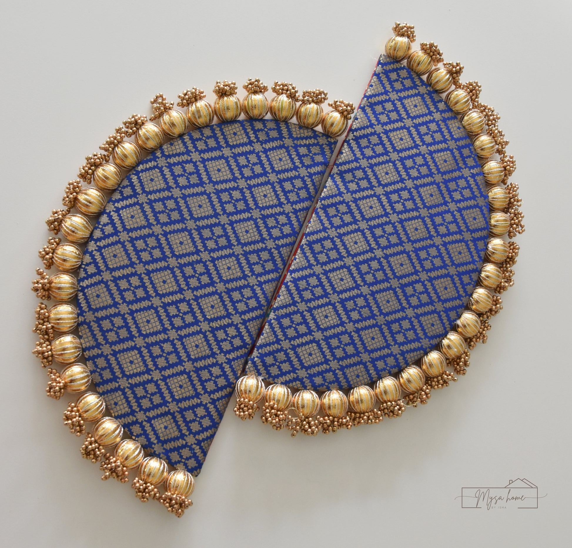 Illuminate and decorate your Home, Puja, and celebrations with our exquisite Reversible Mat/ Aasan D- plate. This platter set adds color, beauty, and tradition to your home. They can be used as an aasana for gods/ as a circle or semi-circle decoration piece. Add this stunning piece to your Diwali decor, puja room, or as a thoughtful gift for loved ones.