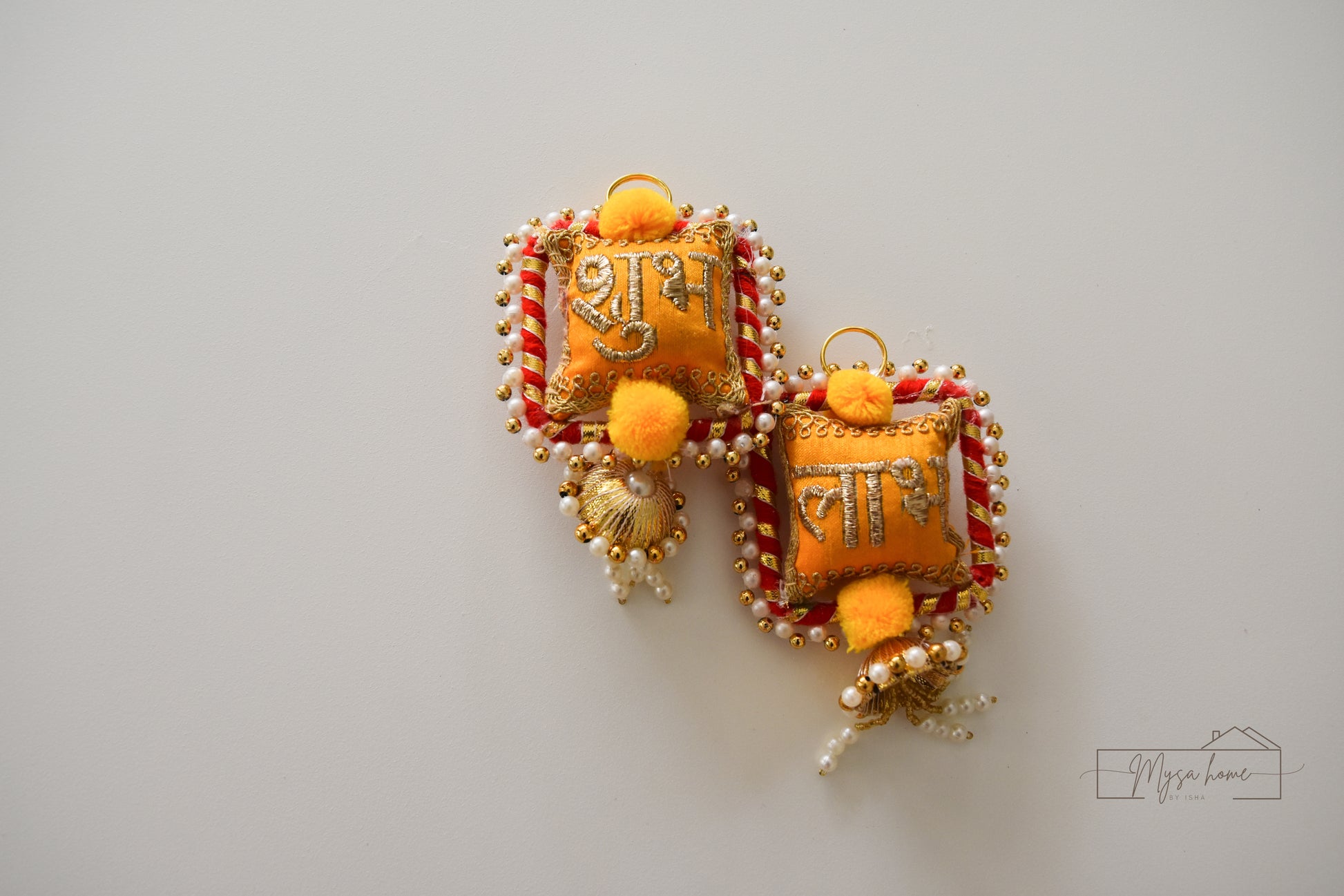 Illuminate and decorate your Home, Puja, and celebrations with our Shubh Labh hanging set of 2. The hanging comes with auspicious words, Shubh (good) - Labh (Luck) written on it. Add this stunning piece to your Diwali decor, puja room, or as a thoughtful gift on festivities or housewarming for loved ones.